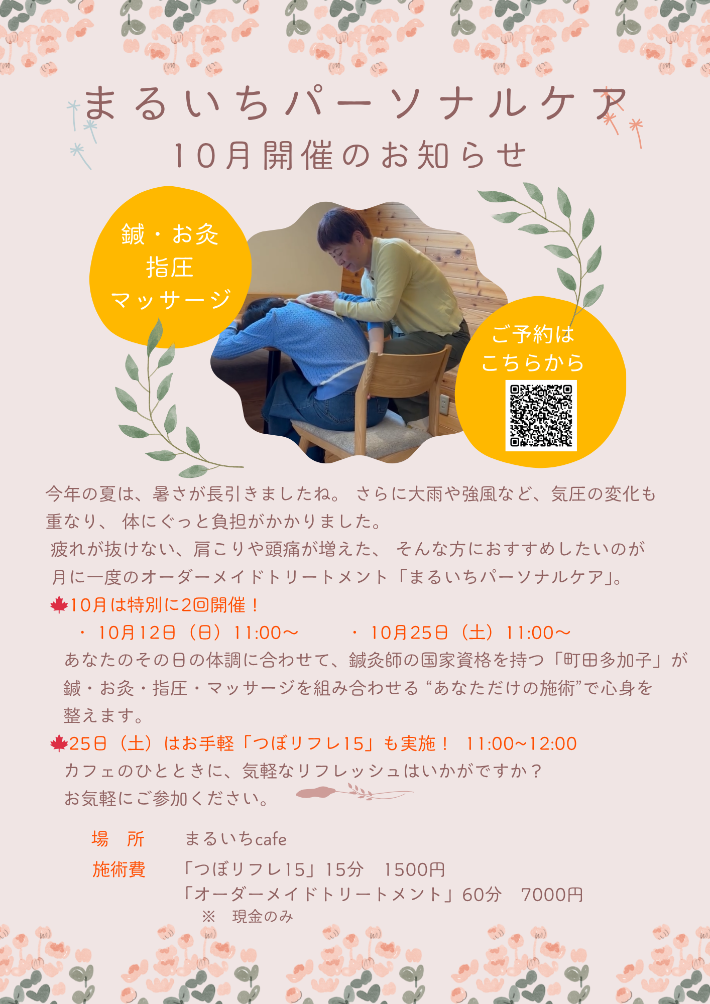 鍼灸師が施術するマッサージ『つぼリフレ15』 8/23(土) まるいちCafeで開催します